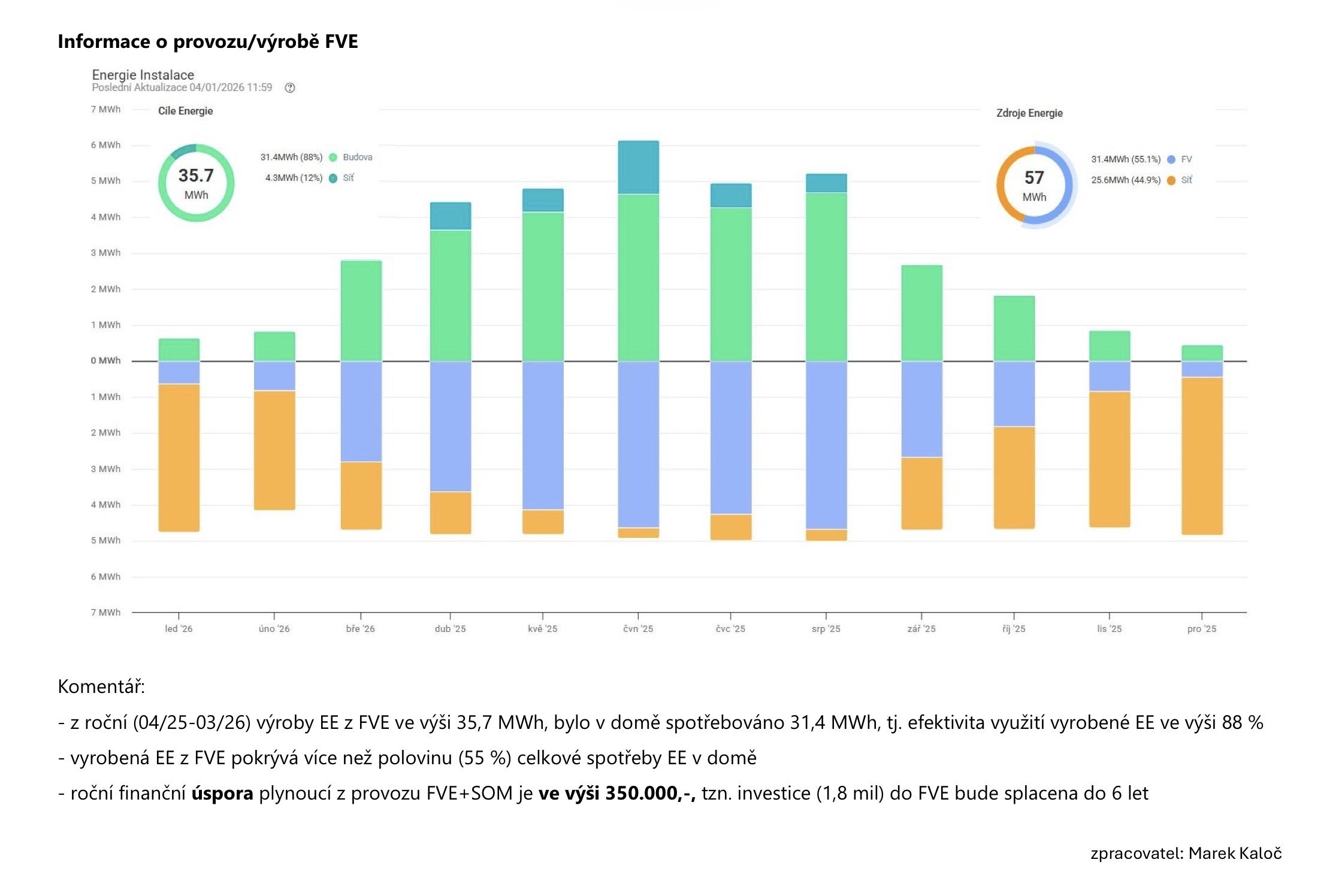 Data provozu za období 4/25–3/26 jsou následující: EE/FVE: spotřeba BD – 57 MWh; výroba FVE – 36 MWh; spotřeba v domě – 31,5 MWh; export – 4,5 MWh, nákup – 25,5 MWh.